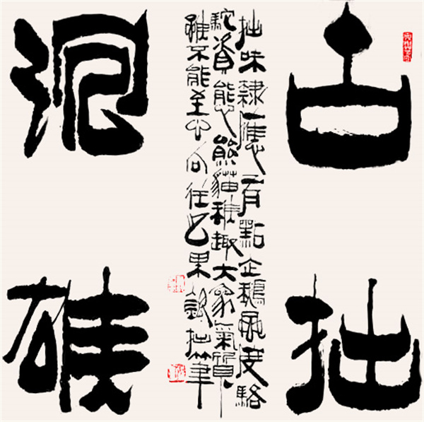 草隶(漩涡隶)是董果银书法最具突破性的创见。其草隶作品,字形的解构与重组达到了近乎狂草的境界,却又始终锚定于隶书的精神内核。线条的缠绕、墨色的涨落,形成极具视觉冲击力的“漩涡”意象,这是对“书之妙道,神采为上,形质次之”(王僧虔《笔意赞》)的极致诠释。他以“漩涡”的形态,营造出强烈的艺术场域,将隶书的古朴转化为现代的抽象审美,在看似“狂狷”的笔墨背后,是对隶书线条质感的精准把控——中锋的使转、墨色的浓淡枯湿,皆为“隶”之骨相服务。这种探索,是在传统隶书的边界之外拓荒,为隶书艺术开辟了新的审美维度,让隶书从“碑碣之书”的固有印象中走出,进入当代艺术的多元对话空间。