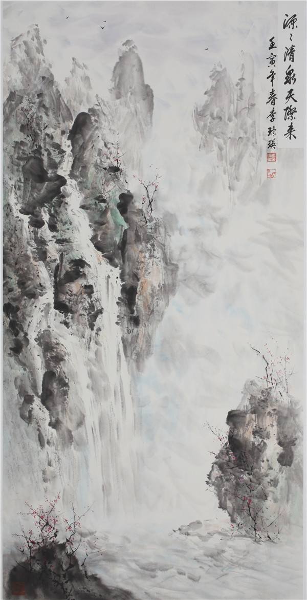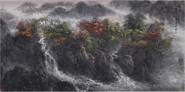 郭熙在《林泉高致》中提出 “山有高远、深远、平远”,李璟瑛的山水创作恰是对 “三远法” 的生动诠释。以高远法构景,山峦耸峙如壁,瀑布飞流直下,云雾以淡墨层层渲染,使画面纵深无尽,尽显 “深远不尽而见于言外” 的空间张力;融平远与深远于一体,层峦叠嶂在烟云掩映中若隐若现,树木的红绿斑斓与水墨山石形成强烈视觉对比,既得 “烟云变灭,凌虚缥缈” 的古典气韵,又因明快色彩传递出当代审美意趣。