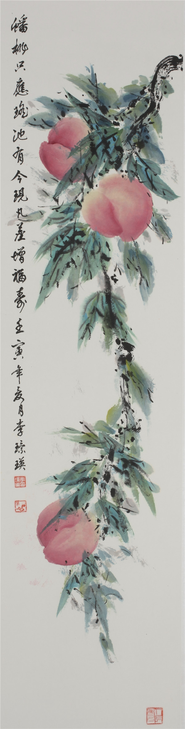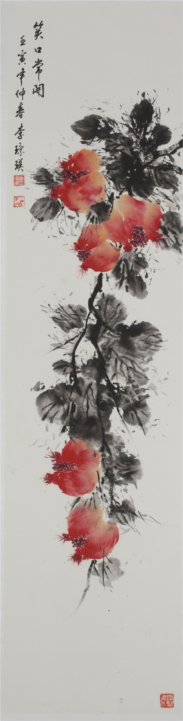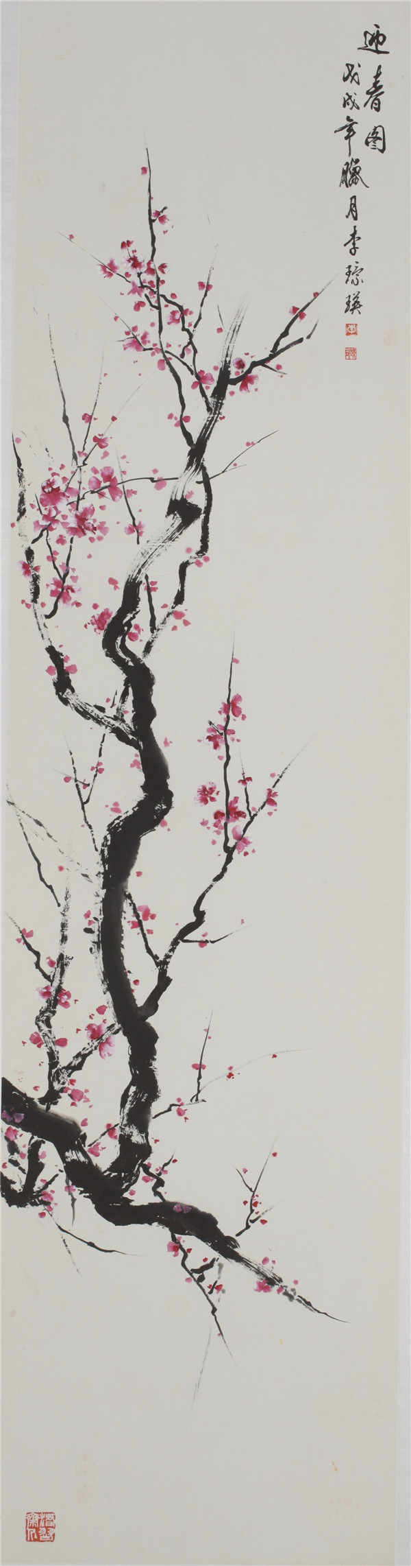谢赫 “六法” 中 “气韵生动”“骨法用笔” 的精髓,在李璟瑛的花鸟画中得到淋漓尽致的展现。以夸张造型、明艳色彩传递吉祥意蕴,用笔洒脱不羁,颇得徐渭、吴昌硕大写意传统的 “写意” 精神,却又在色彩把控上更具现代感,艳而不俗、活脱生动,将传统吉祥题材演绎出当代生活意趣。画梅花,枝干虬曲如铁,梅花点点如霞,恰是 “疏影横斜水清浅” 的诗意具象。用笔简练却风骨凛然,既契合 “梅以曲为美,直则无姿” 的古典审美,又以极简构图、明快色彩呼应当代视觉习惯,于传统文人梅的孤高之外,添了几分蓬勃的时代生气。