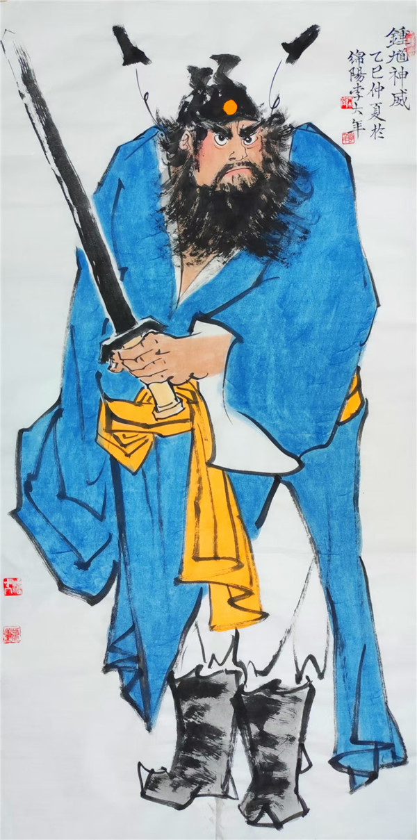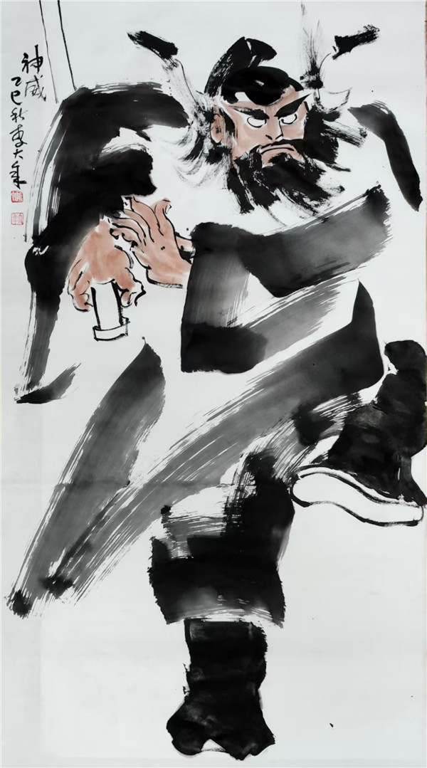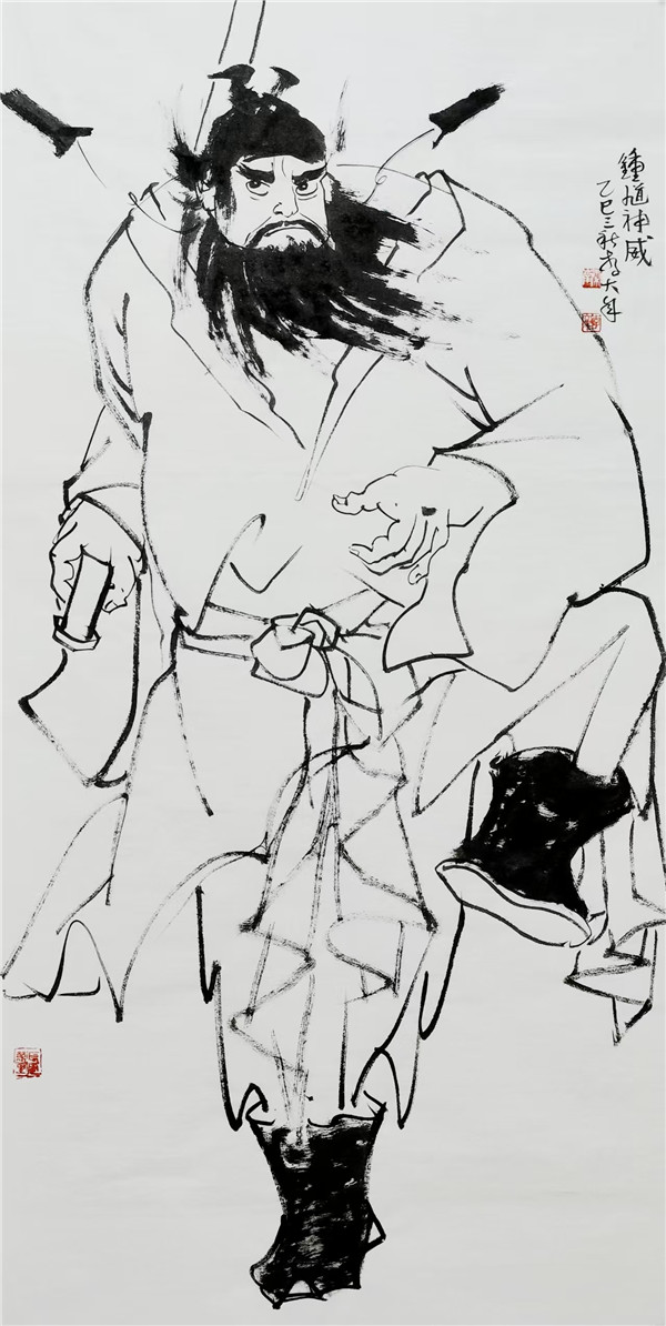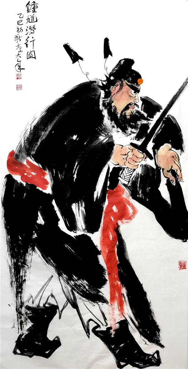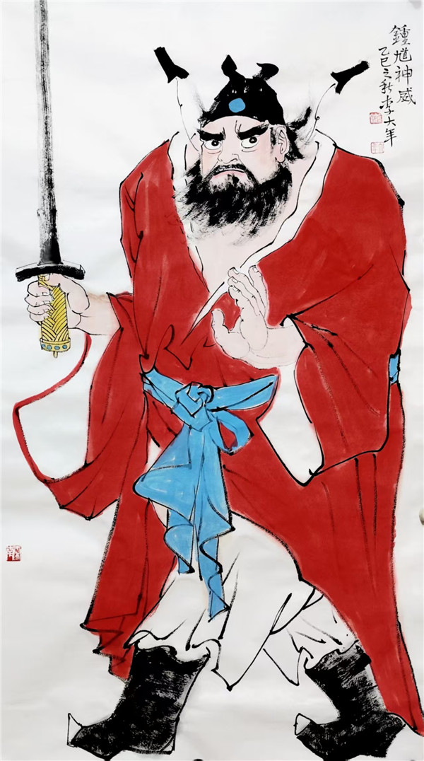 传统人物画强调 “以形写神”,李大年笔下的钟馗,形貌夸张却神态逼真,眼神的凌厉、身姿的张力,皆传递出 “驱邪镇恶” 的精神内核,这正是“气韵生动”的鲜活体现。他并非对传统人物画范式的简单复刻,而是在传承“形神兼备”审美理想的基础上,以现代笔墨语言重塑经典形象,让钟馗这一古老题材在当代焕发新的生命力,正如荆浩《笔法记》所云 “气者,心随笔运,取象不惑”,李大年以心驭笔,令笔下人物气脉贯通,意态万千。