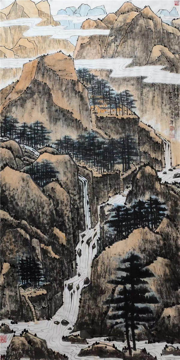 其山水画创作呈现出多元面貌,传统山水画追求 “可望、可行、可游、可居” 的境界,李大年的山水恰恰在 “景” 与 “笔” 的交融中实现了这一追求。他深谙荆浩 “六要” 中 “景者,制度时因,搜妙创真”的理法,精心营构山林屋宇、路径泉流,使观者如临其境;又以灵活的笔墨驾驭不同风格,或工笔勾染,或水墨写意,在 “笔” 与 “墨” 的碰撞中,让山水既有传统山水的意境深度,又有当代审美的视觉冲击,暗合董其昌 “南北宗论” 中对笔墨意趣的推崇,于刚柔、浓淡、虚实之间,寻得传统与现代的平衡。